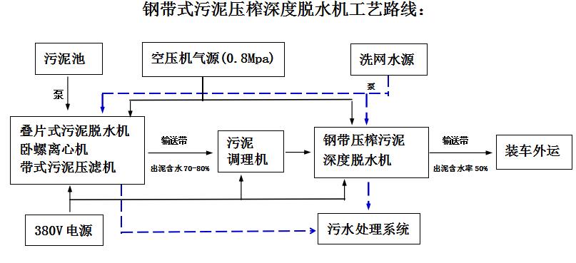 因?yàn)槠胀◣綁簽V機(jī),疊片式污泥脫水機(jī),臥螺離心機(jī)等設(shè)備的出泥含水率太高,一般在70%-85%之間,造成污泥的運(yùn)輸成本、接收處置成本過(guò)高。為了降低污泥的處置成本和提高燃燒值,就必須深度脫水,包括板框壓濾機(jī)(污泥濃度40%左右),再次的深度壓榨脫水。經(jīng)過(guò)雙網(wǎng)鋼帶壓濾機(jī)后的污泥濃度可以達(dá)到40%-52%之間,具體情況視污泥種類而定。明顯降低運(yùn)輸及處置成本。