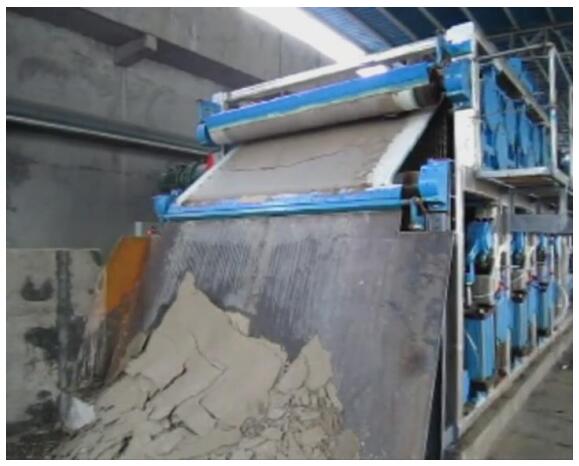 4、出泥濃度高達(dá)40-52%,出泥比板框式污泥壓濾機(jī)高10個(gè)百分點(diǎn)以上。而且含水率均衡,接收單位隨意抽檢污泥,其測(cè)得含水率數(shù)值是幾乎相同的。這一點(diǎn)是板框壓濾機(jī)做不到的。(因?yàn)榘蹇驂簽V機(jī)的進(jìn)泥是靠高壓泵加壓完成的,進(jìn)泥通道和中間污泥含水率高,靠濾布兩面含水率低,俗稱為夾心餅干式結(jié)構(gòu))。