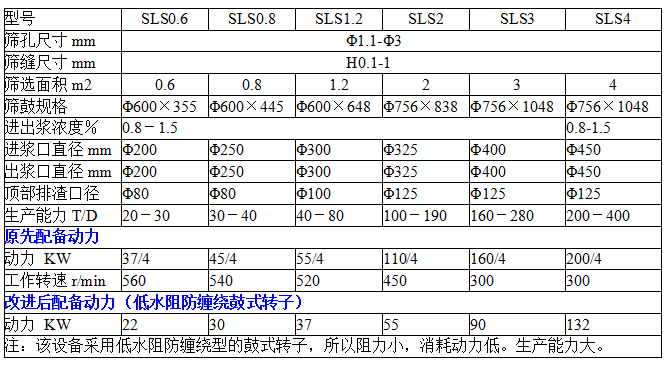 眾所周知,再生紙漿中的雜質分輕雜質、重雜質兩部分。傳統型壓力篩由上部進料,底部排渣,輕重雜質都通過整個篩漿區。由于回收的廢紙箱漿料中會含有很多鐵釘、錠箱釘、砂石等硬質雜質,當這部分雜質通過篩選區時勢必會給篩鼓及旋翼造成嚴重的磨損與破壞。嚴重的會擊破篩鼓。SLS型升流壓力篩采取底部進漿、底部排重渣、頂部排輕渣的升流式結構設計,有效地解決了上述問題。重雜質一進入機體即被甩到底部沉渣槽,由重渣排渣管間歇或者連續排出機外,輕雜質在壓力作用下升到頂部排渣口排出。這樣,一方面有效地縮短了雜質在篩區的停留時間,降低了雜質循環的可能性,提高了篩選效率;另一方面防止重雜質對轉子和篩鼓造成的損壞,延長設備的使用壽命。